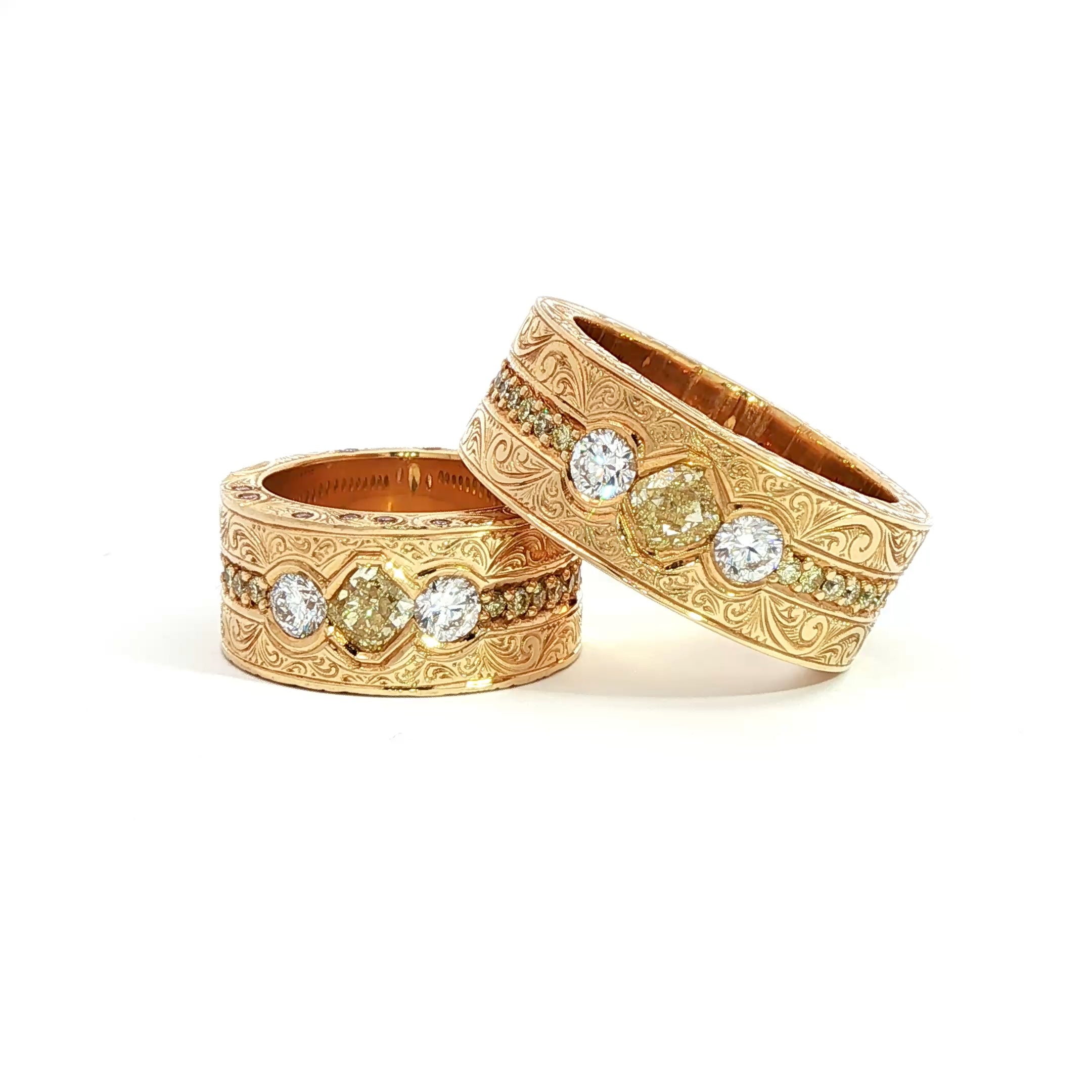 8ct yellow gold engraved Gents & ladies matching diamond wedding ring set