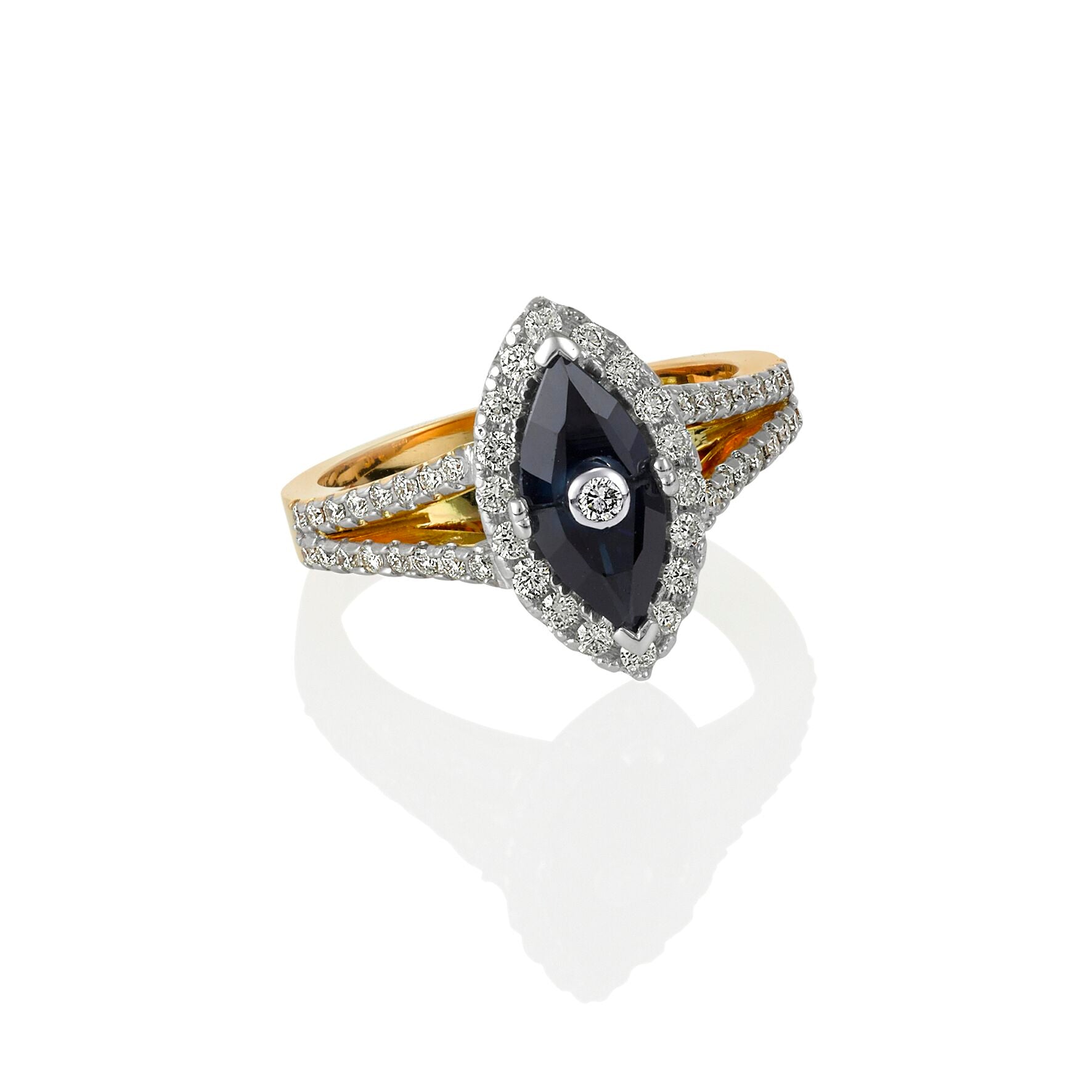 18ct Yellow and White Gold Custom Designed Sapphire and Diamond Ring. Set with 2x fancy cut Sapphires. 32x 0.01ct , 18x 0.02ct and 1x 0.03ct Brilliant Cut Diamonds. Quality: FSI2