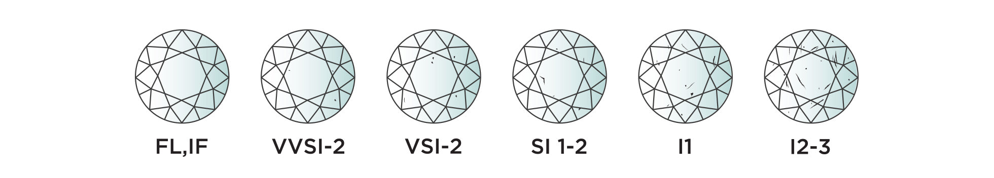 This relates to the marks of non-crystallised carbon called 'inclusions' found within the diamond. The inclusions vary in standards on the spectrum ranging from FL (flawless), SI1 () to I3. It is exceedingly rare for a diamond to be flawless, known as FL and is the highest level on the spectrum. SI1 is in the middle of the spectrum and it is recommended when buying a diamond, you should not purchase lower than this standard. I3 is the lowest as it includes the mot inclusions and is least clear.