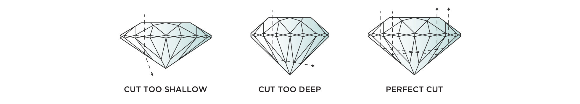 The cut of a stone is not relating to the shape, but refers to the way the cutter has formed it to best ensure that light bounces within the stone and back out through the top. If it has a defective cut (too long or too short) the light refracts on the inside and falls out down the bottom. This decreases the brightness and lustre of the stone. A well cut stone is neither exceedingly long nor shallow, it is luminous and will always dazzle even when dirty.The grading system varies from Ideal Cut to Good and lastly, Poor Cut. With round diamonds, it is suggested to never purchase below 'Very Good' and 'Good' in all other shapes. Again, the better cut stone the more it will cost.